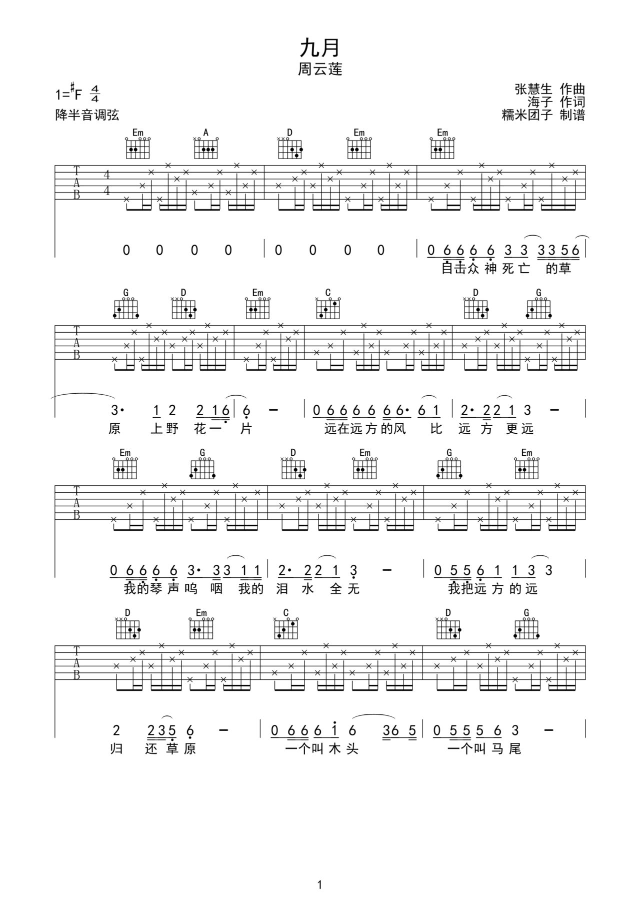 九月吉他谱f调_周云蓬九月六线谱 吉他谱