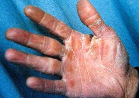 糜烂型病人为汗多者,其手足部皮肤潮湿,浸渍,呈白色腐皮,除去腐皮