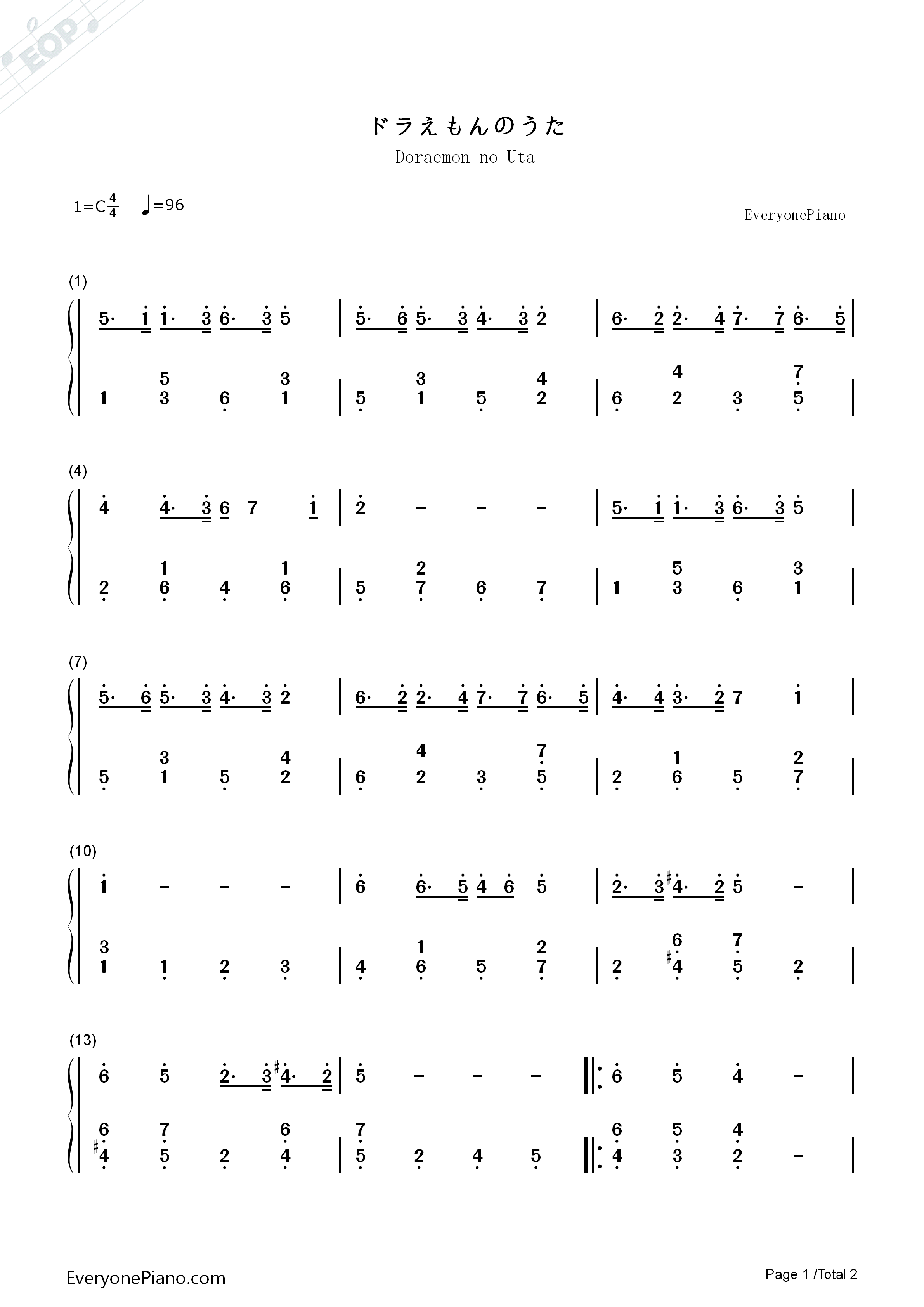 哆啦a梦(原版)钢琴双手简谱 钢琴谱 钢琴简谱
