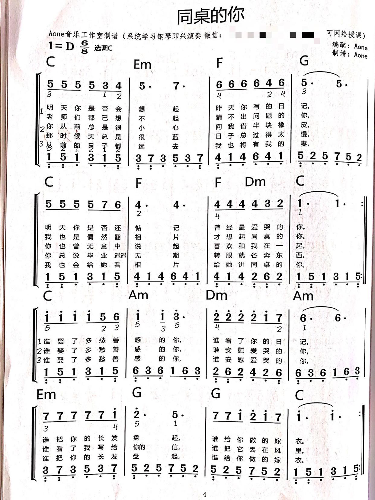 同桌的你 钢琴简谱完整版 简单上手易学