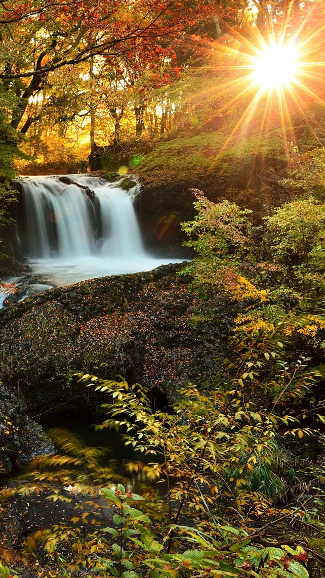 高山瀑布流水自然风景画招财风水墙贴装饰画树林阳光山水壁画定制