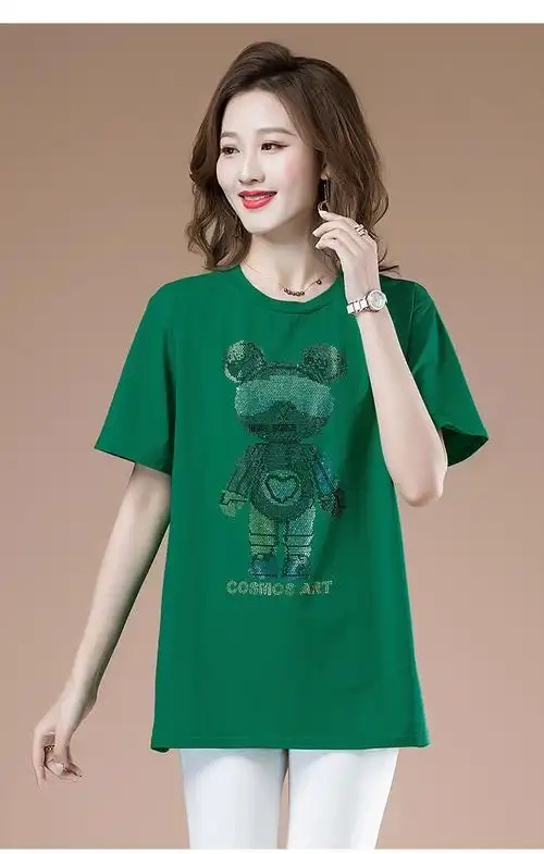 中年妇女夏天中款上衣四十岁夏装大码棉短袖t恤衫宽松遮肚 白色订珠