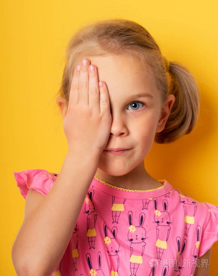 在孤立的背景上微笑,笑着,用手捂着眼睛,为惊喜