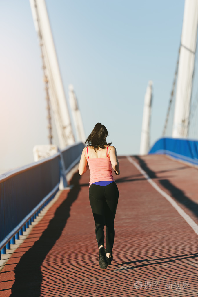 年轻的健身女跑步运动员在城市桥梁上运行