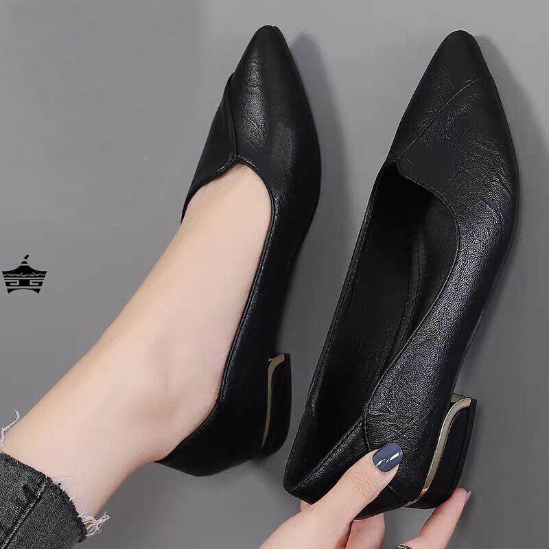 真软皮尖头粗跟平底单鞋职业女鞋黑色工作鞋软底银行酒店上班皮鞋