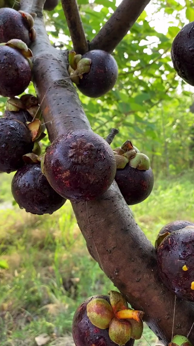 树上的山竹真像一大串紫色的葡萄,非常诱人.