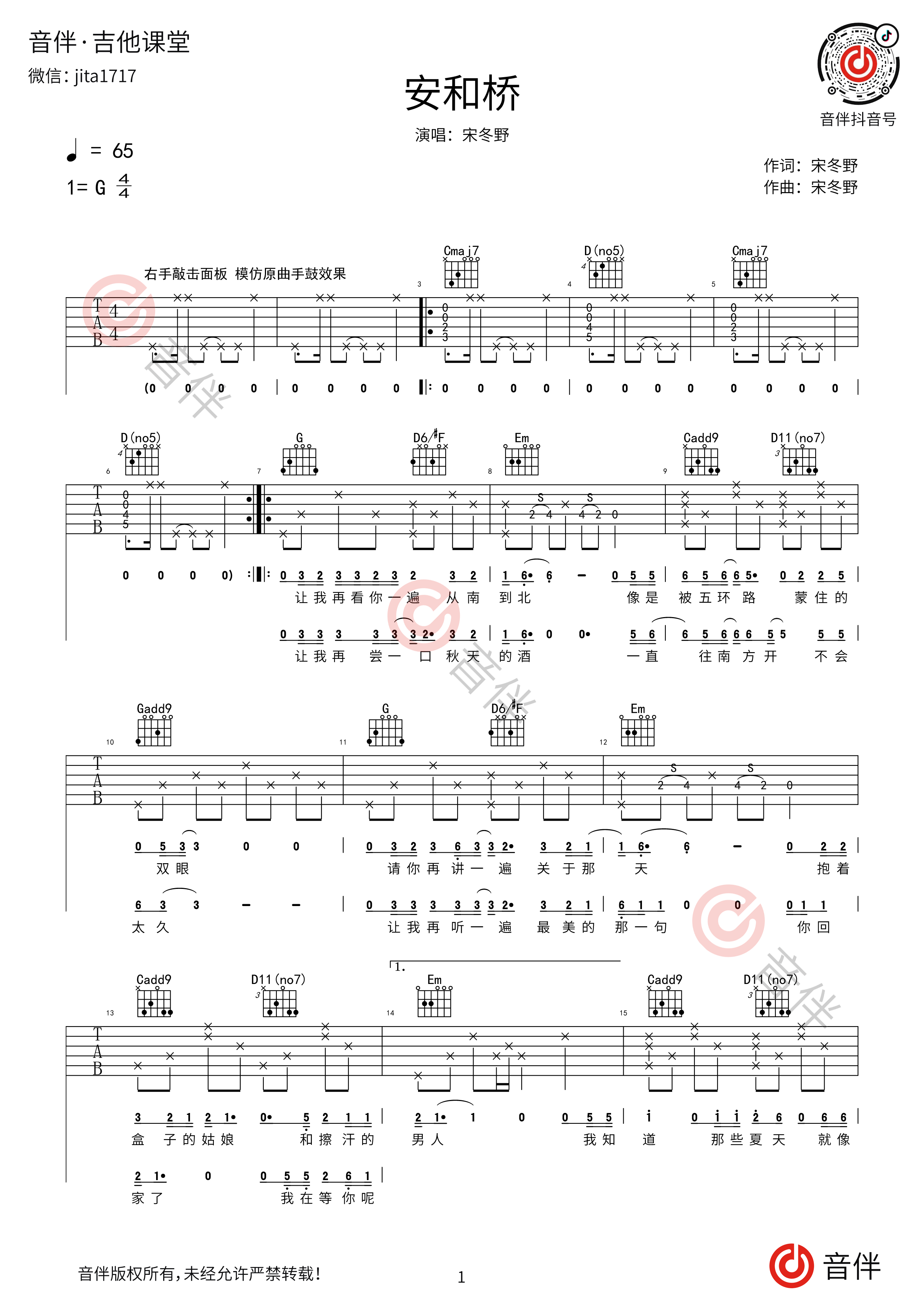 宋冬野安和桥吉他谱g调超原版完美前奏间奏尾奏