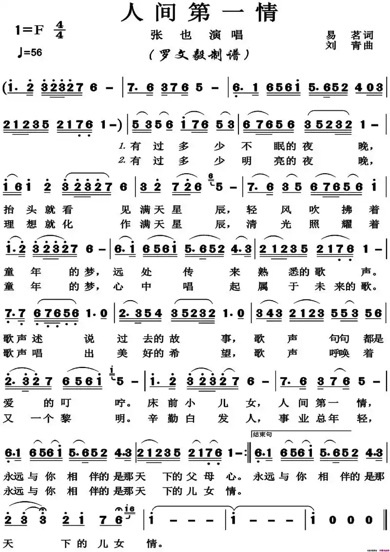 人间第一情简谱(歌词)_张也演唱_君羊制谱