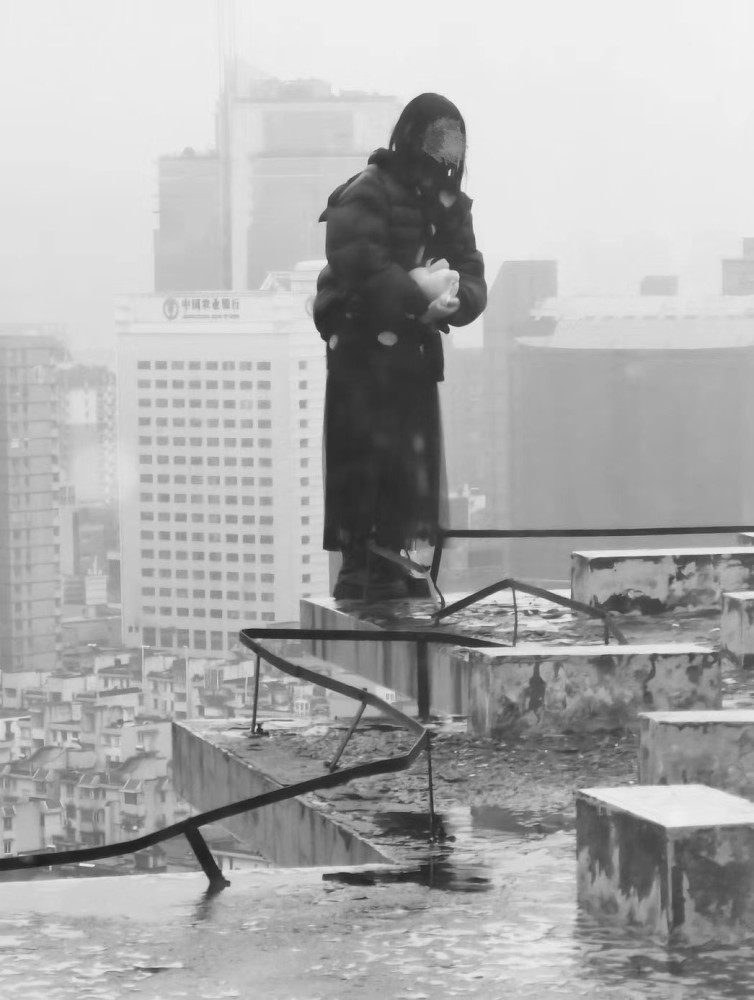 男子瘦弱的身躯被风吹得有些站不住,他一步一步地向楼顶的边缘走去,几