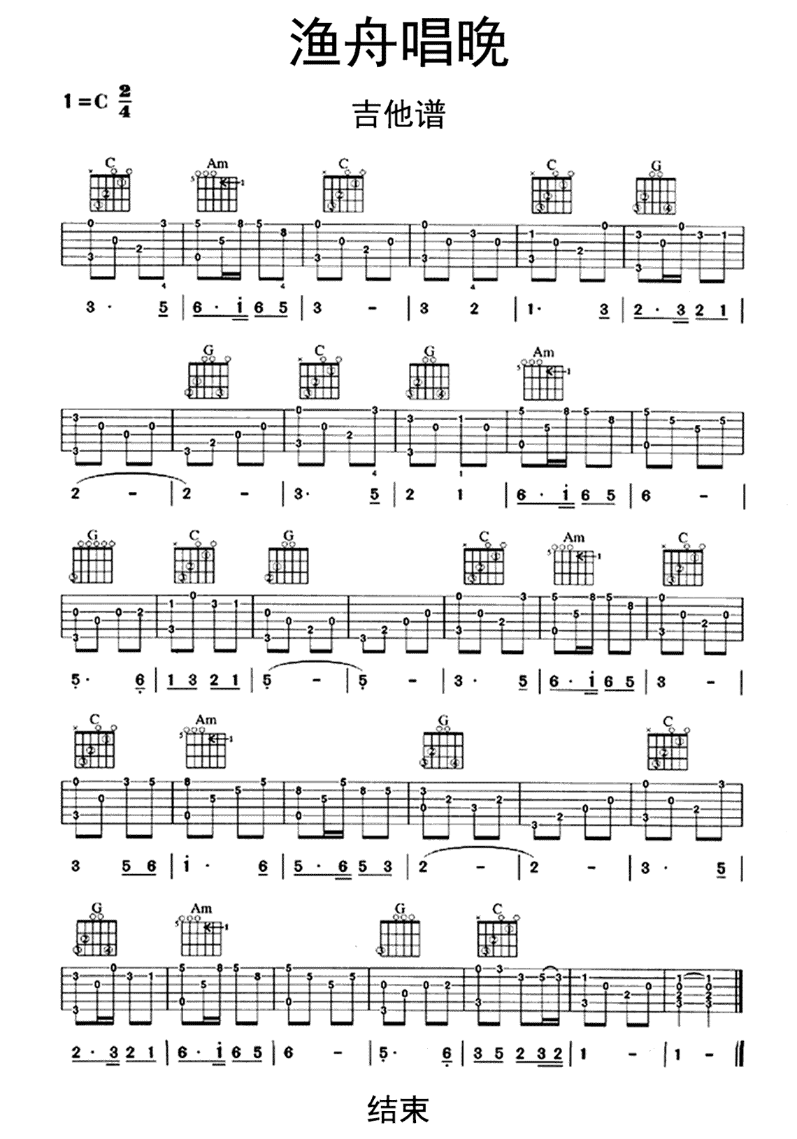 中外吉他名曲《渔舟唱晚》六线谱_吉他曲谱