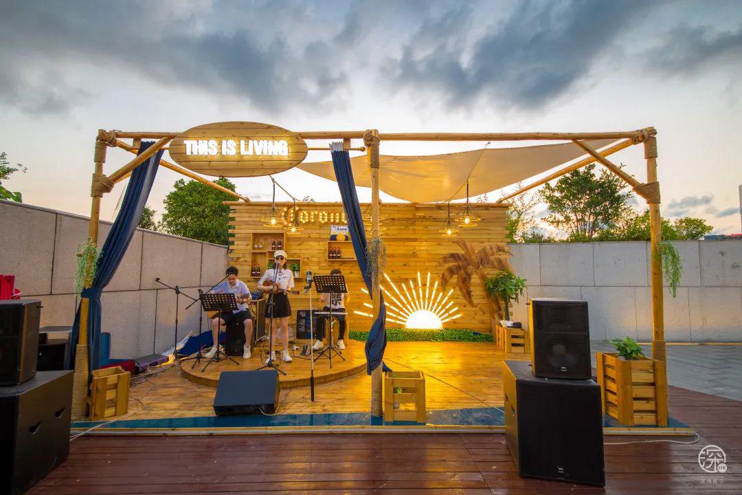 当夜幕降临,在迷人的灯光下,室外的小舞台,驻唱乐队已经整装待发,舒缓