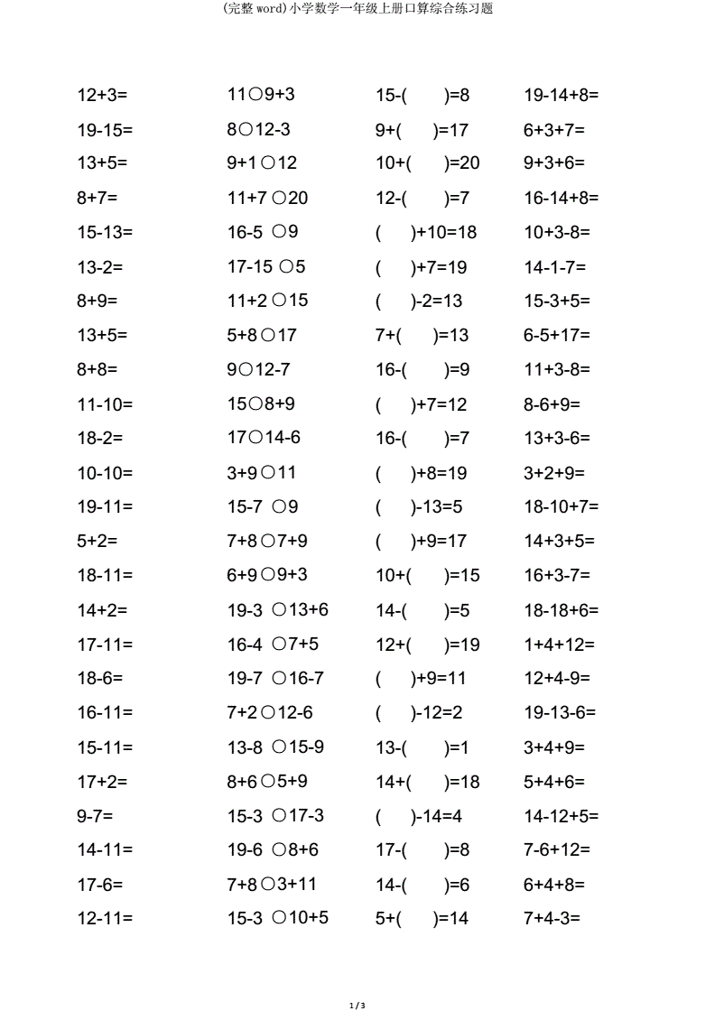 完整版一年级上学期数学20以内加减法口算题卡pdf41页