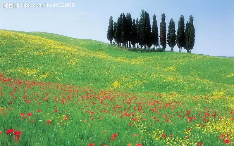 山鲜花杉木树天空云5k风景壁纸