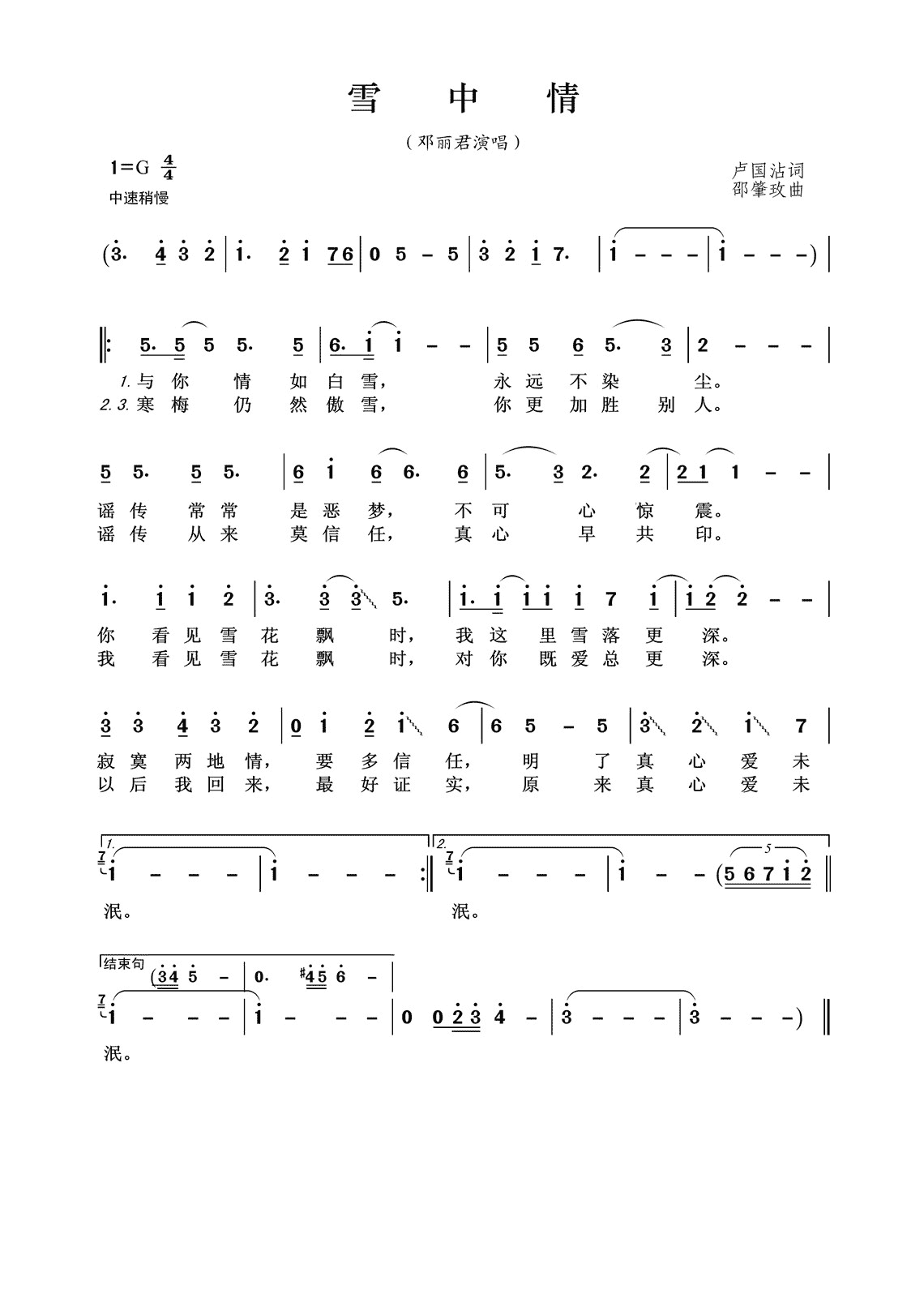 邓丽君-雪中情 简谱 歌谱