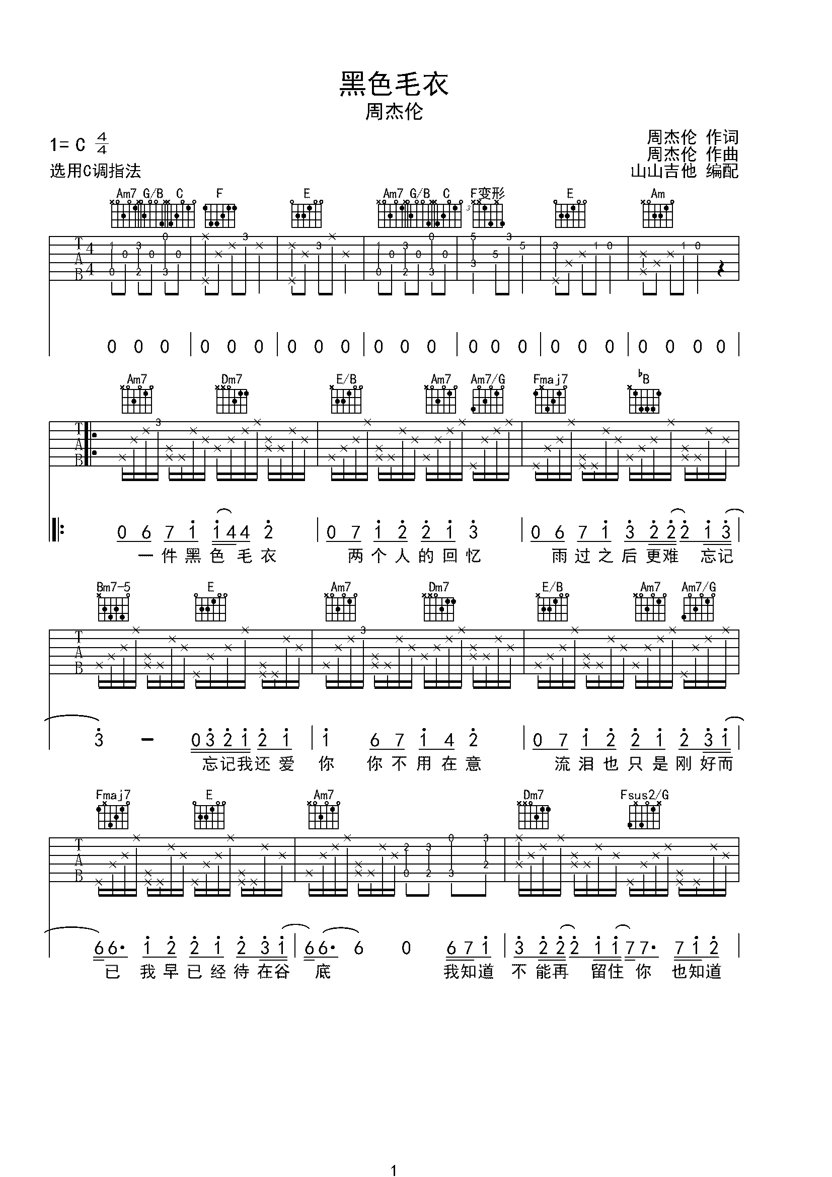 黑色毛衣吉他谱c调六线谱简单版周杰伦