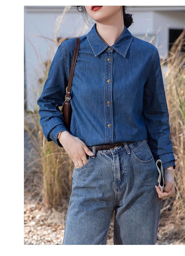 深蓝色牛仔衬衫女春装2024年新款正肩内搭叠穿设计感小个子软衬衣