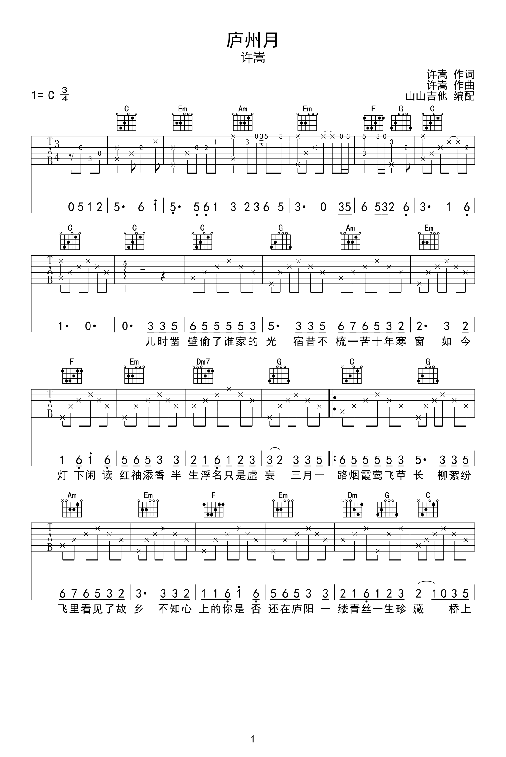 《庐州月》吉他谱-许嵩-高清六线谱图片谱