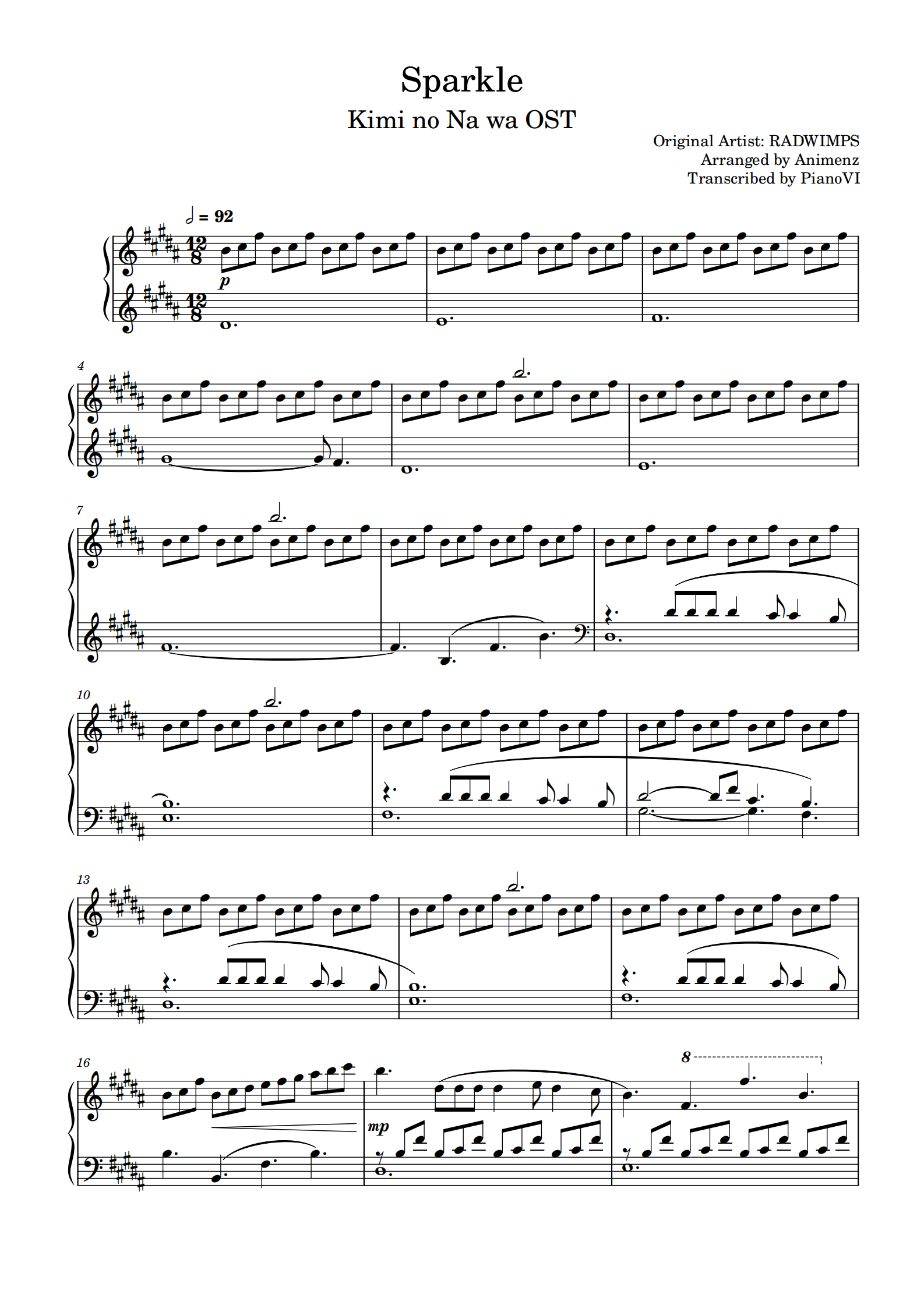 火花-《你的名字》插曲-钢琴谱文件(五线谱,双手简谱,数字谱,midi,pdf