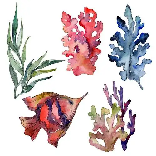 红色水生水下自然珊瑚礁.水彩背景插图集.孤立的珊瑚插图元素.