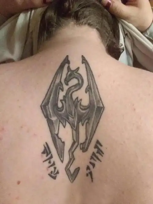 男生后背上黑灰点刺几何线条创意动物龙纹身图片