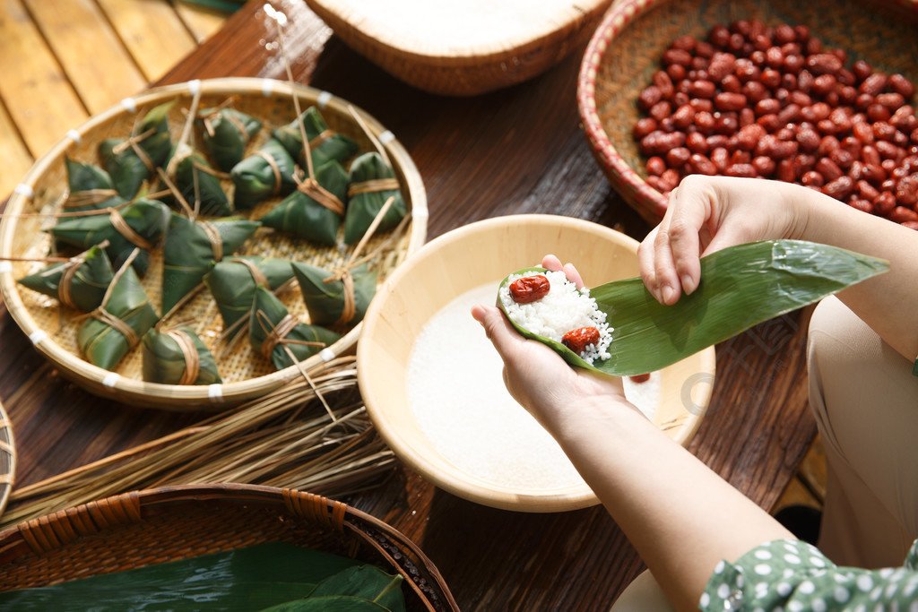 粽子,妇女在木桌上吃粽子,端午节食物端午观,特写,临摹空间,俯视,平放