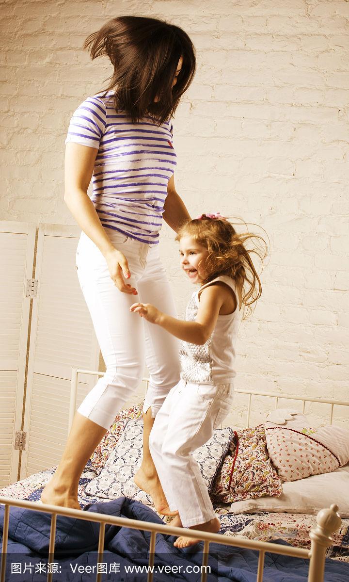 年轻快乐的母亲带着女儿在家