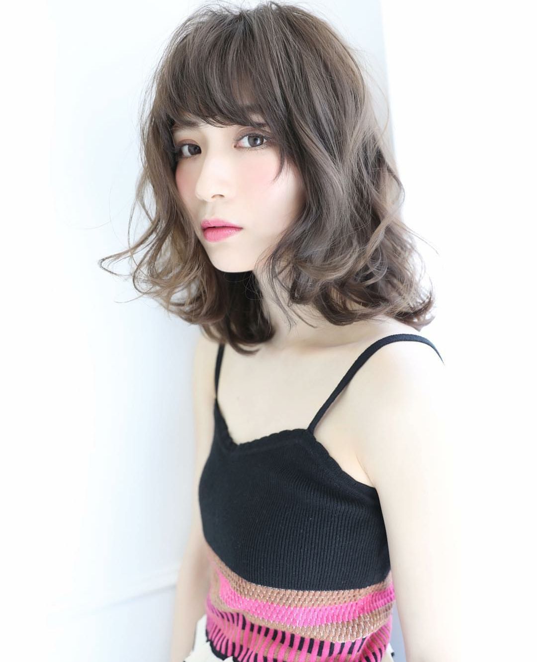 齐肩的中短发发尾也轻轻扣在脸颊,两侧打造出外翘的烫发,很俏皮可爱的