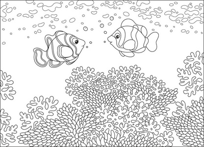 珊瑚礁上游动的有趣鱼类的黑白矢量图大厨枸杞人物卡通矢量插画[动]龟