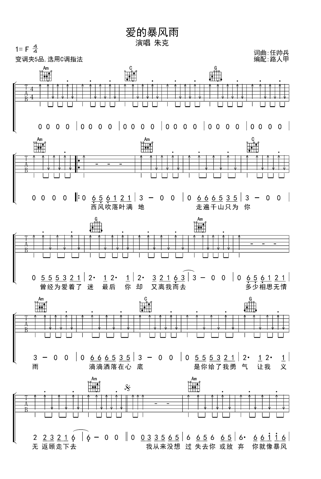 爱的暴风雨吉他谱朱克c调简单版弹唱谱高清六线谱
