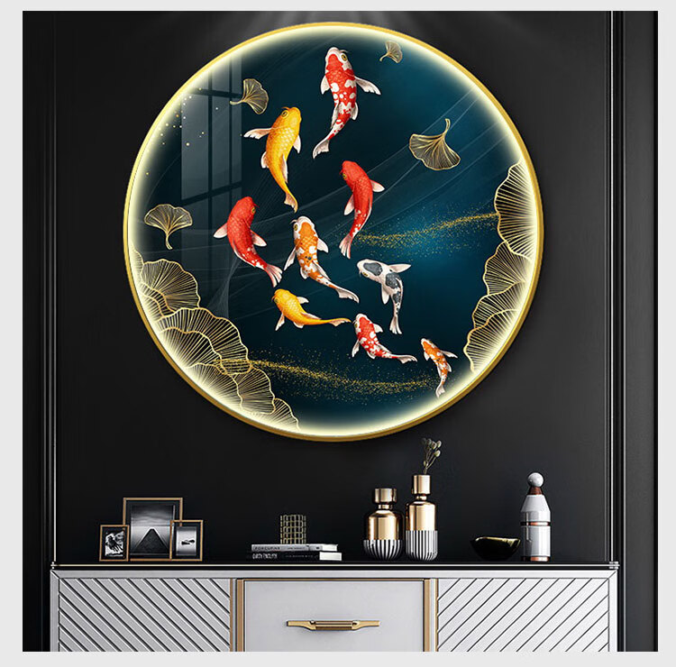 九鱼图入户玄关装饰画轻奢圆形餐厅挂画客厅墙壁画寓意好锦鲤 锦鲤y