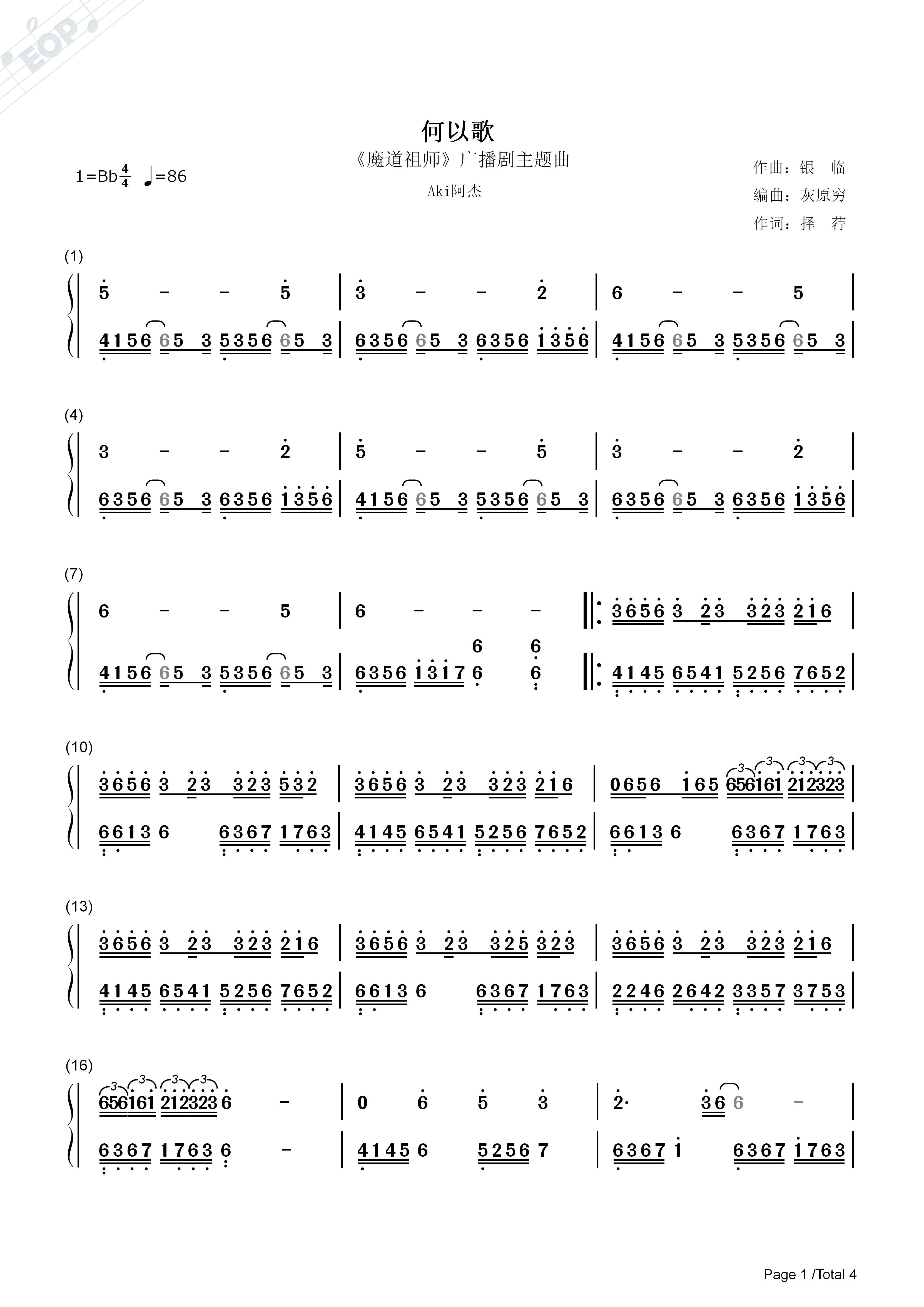 何以歌简谱-aki阿杰-魔道祖师广播剧主题曲-钢琴谱网