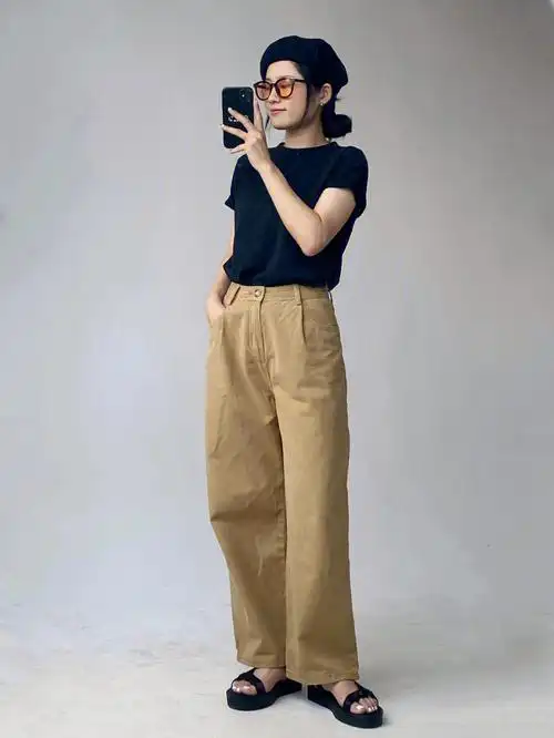 ootd纯黑t恤卡其裤子日系少年感穿搭