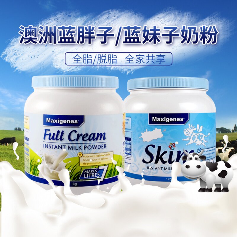 澳大利亚直邮maxigenes美可卓 蓝胖子脱脂 高钙全脂奶粉 1kg/罐