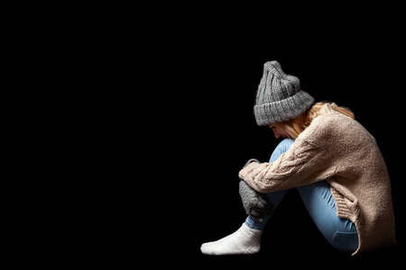 黑色和白色的悲伤的女人抱着她的膝盖哭泣.