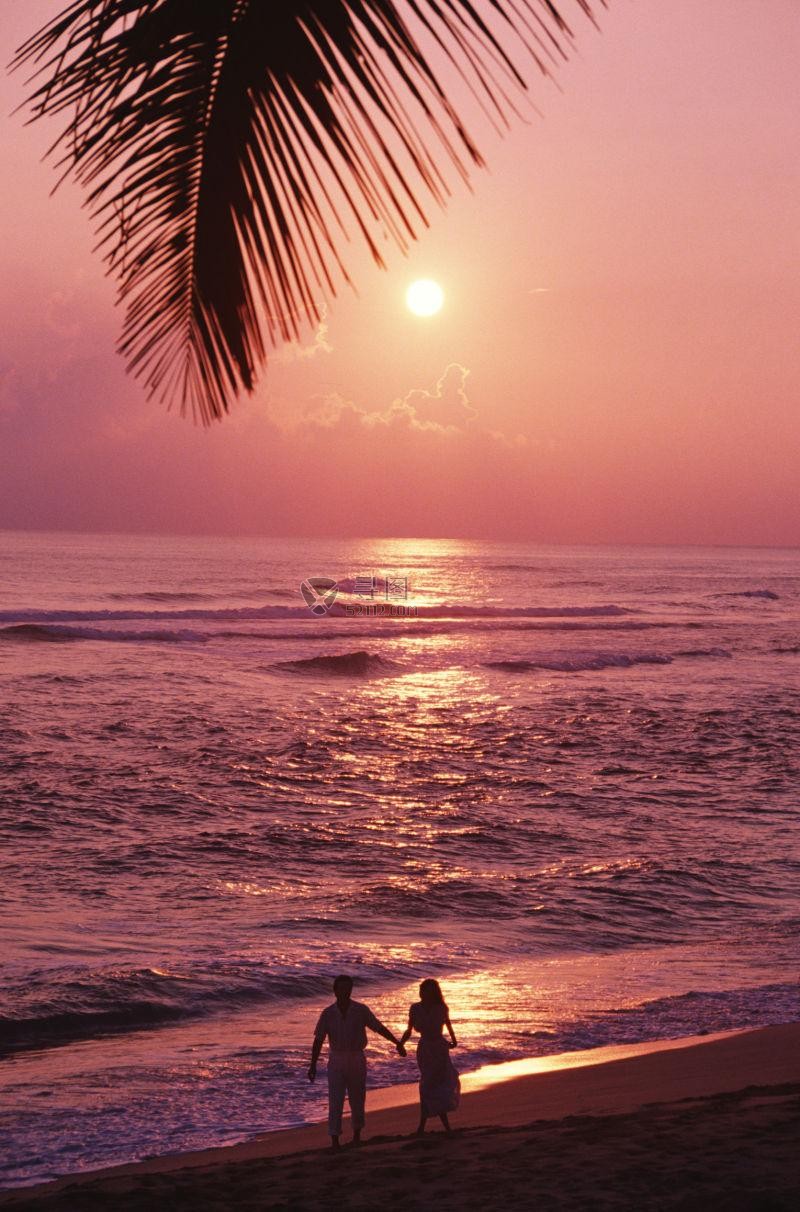 "夕阳下的浪漫,海边牵手的情侣.