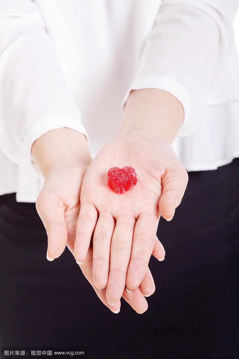 女人的手里拿着一个心形的彩色棒棒糖
