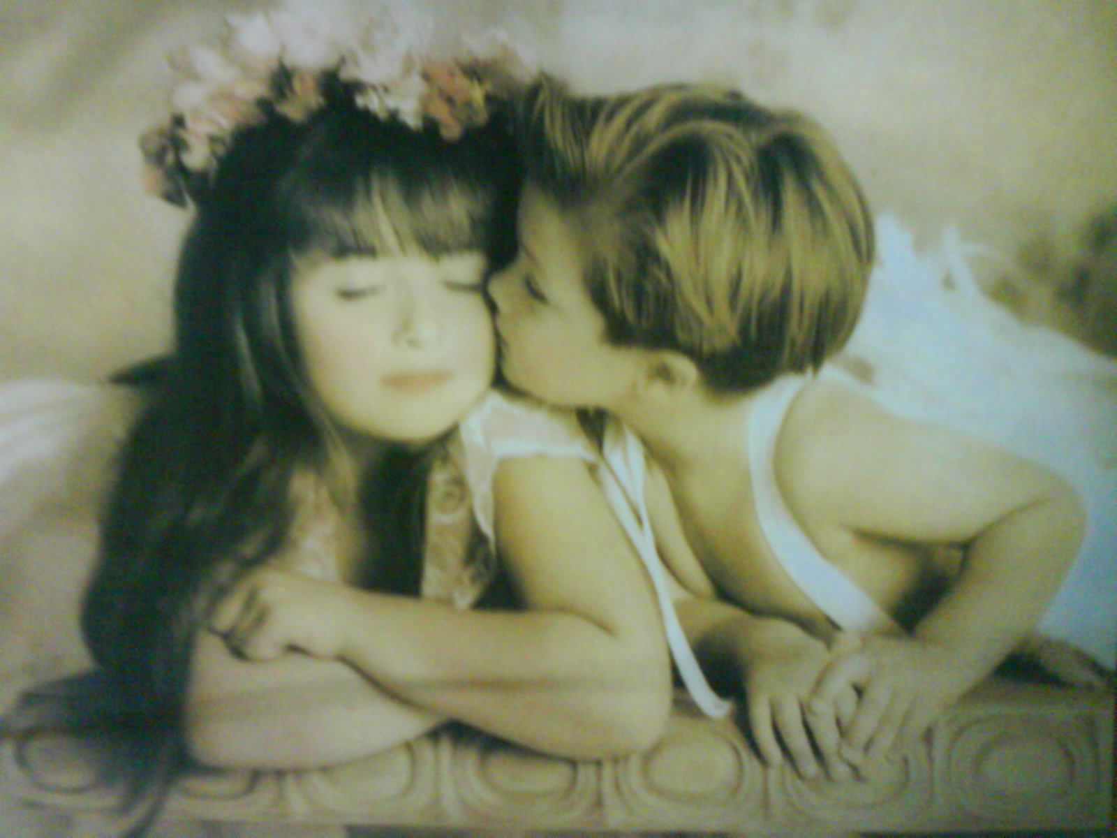 求两个外国小孩图片 趴着,头戴花环,小男孩再亲小女孩的脸