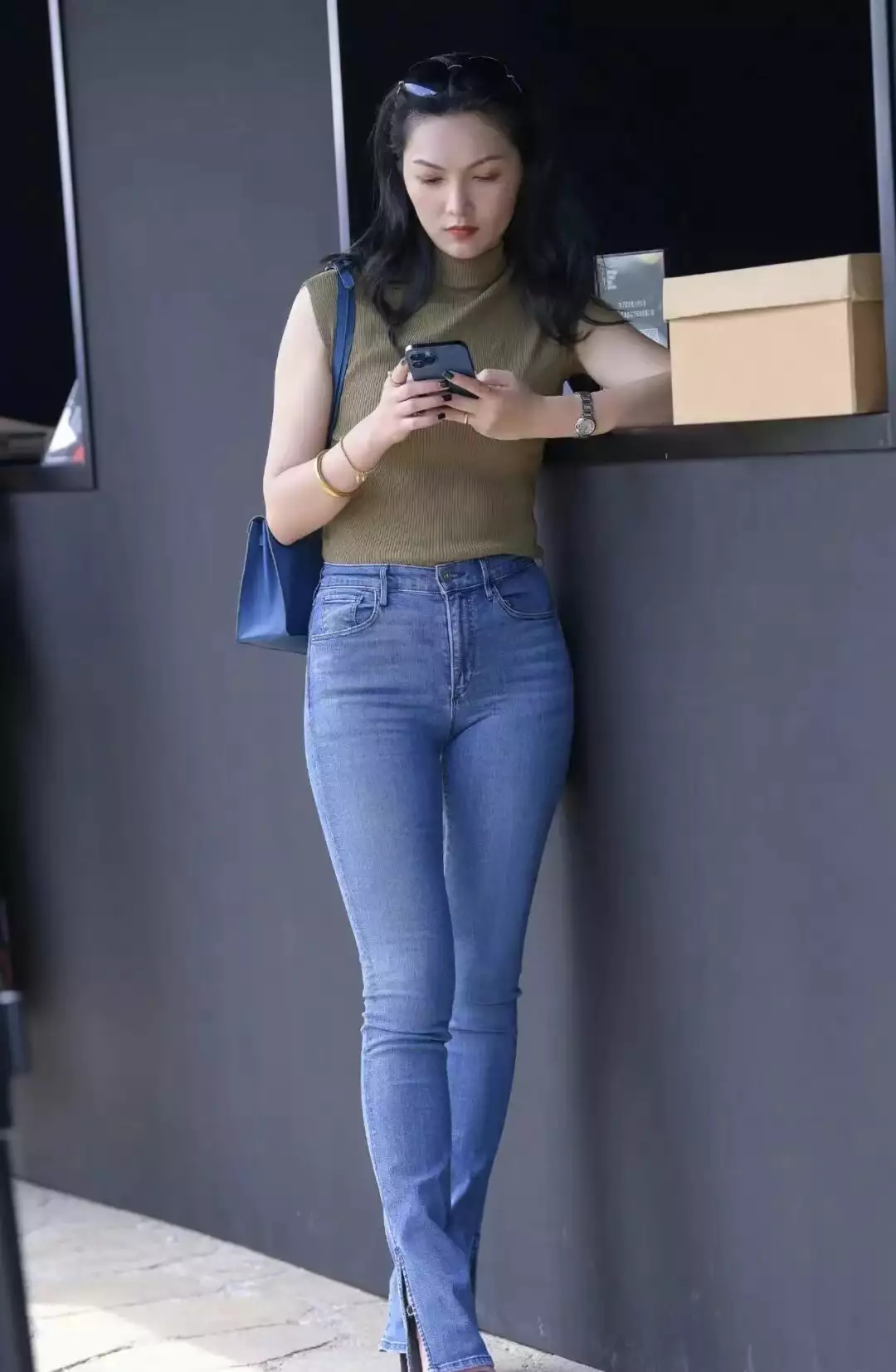 价港风复古深蓝色牛仔高腰修身设计感显瘦长裤阔腿牛仔裤,女装牛仔裤