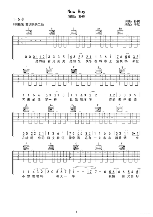 new boy 朴树c调原版吉他谱d调六线pdf谱吉他谱-虫虫吉他谱免费下载