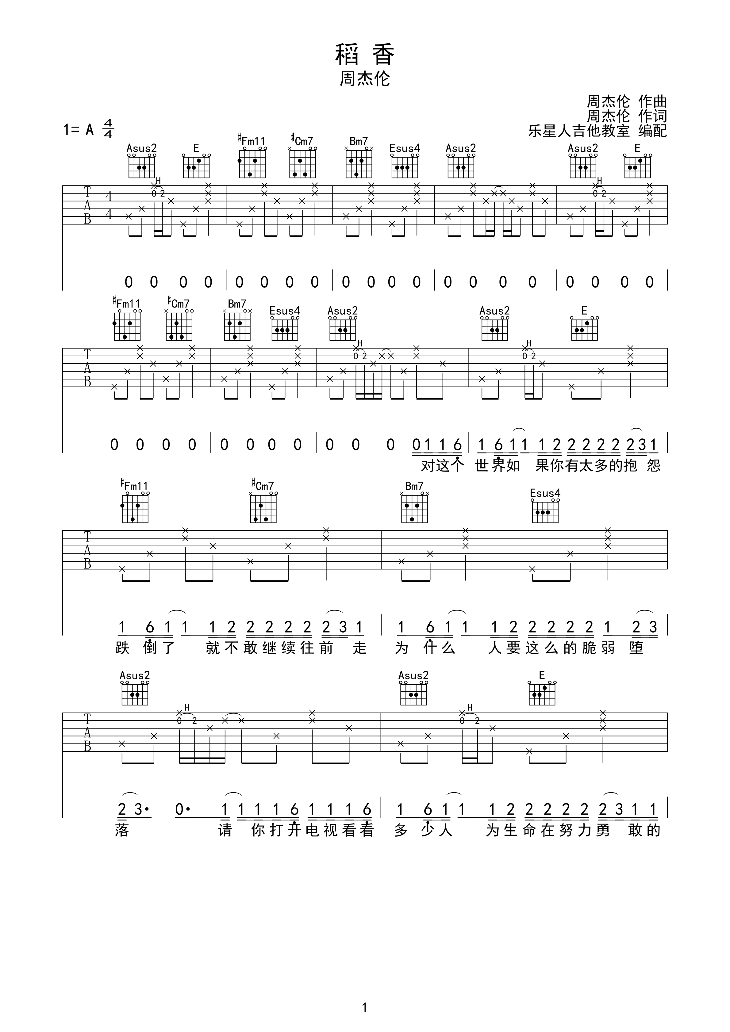稻香吉他谱_周杰伦_高清六线谱第1张