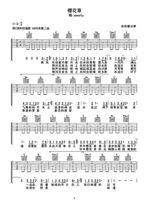 《遇见》吉他谱 男生弹唱版 c调 孙燕姿1