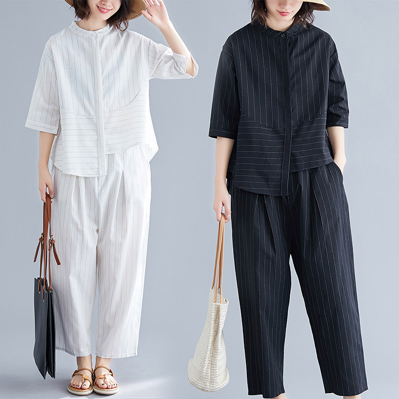大码棉麻套装女夏季新款文艺大码女装复古格子衬衣哈伦裤