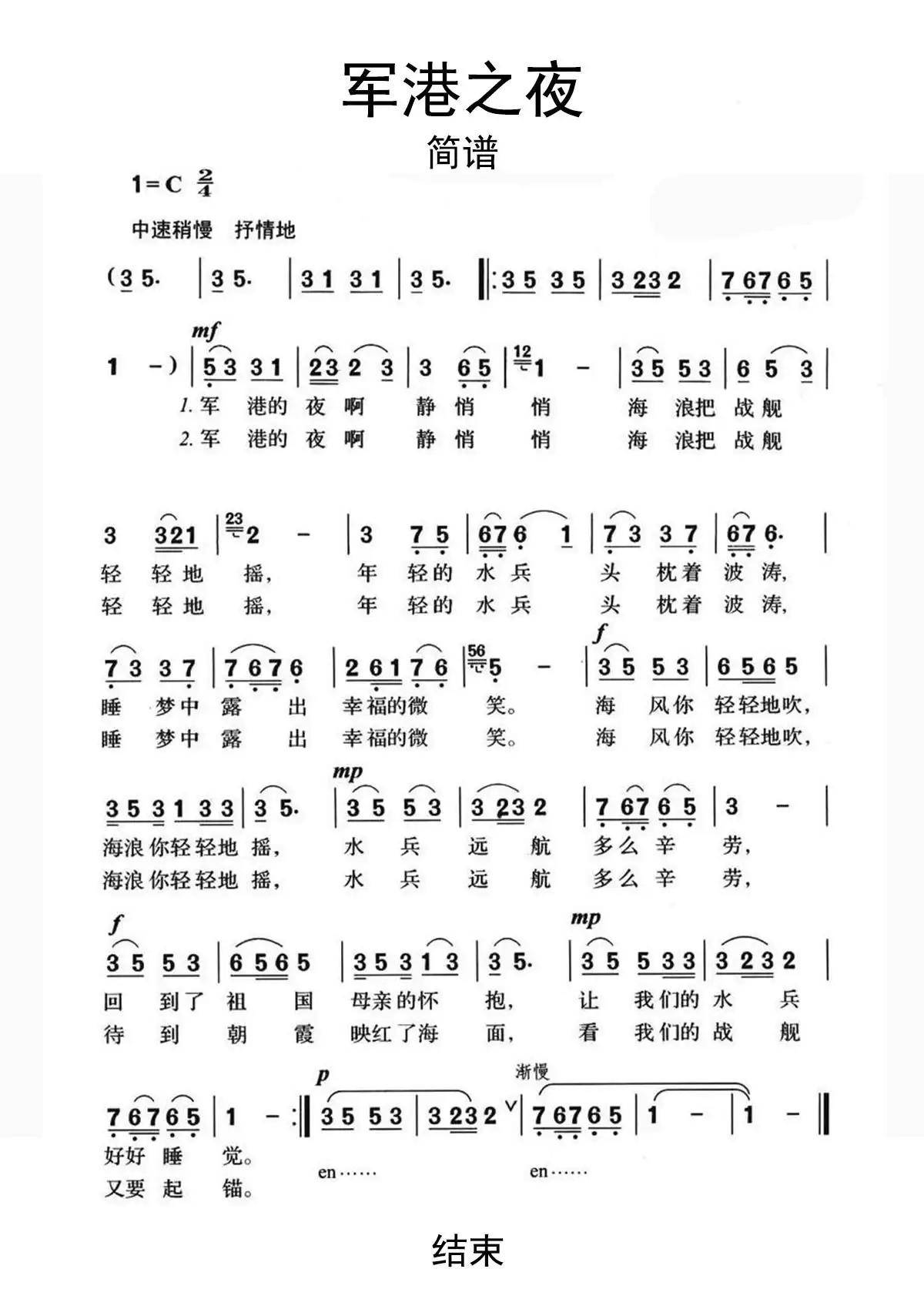军港之夜高清打印歌谱简谱