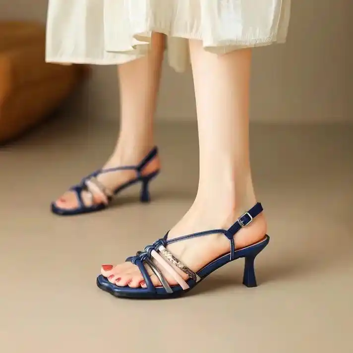 外贸高跟鞋女黑色复古方头露趾一字带细跟夏半凉拖性感网红罗马鞋