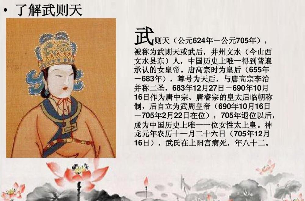 ppt内容介绍中国唯一女帝武则天ppt介绍了武则天的个人简介,她是是
