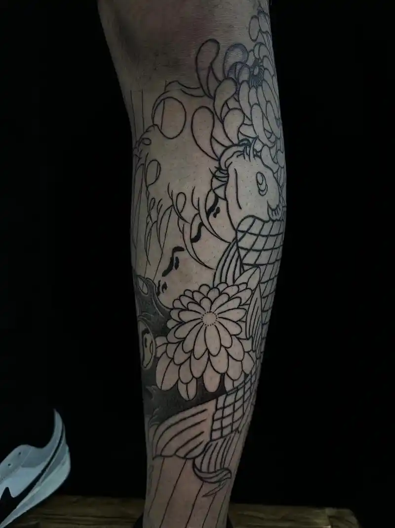 日式老传统 #花腿#老传统纹身 彫婳老师纯手绘构图小腿线 - 抖音