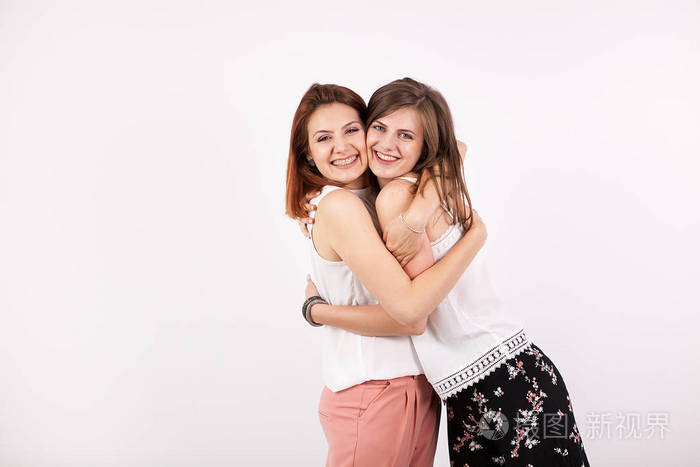年轻女性朋友拥抱在彩色背景的肖像