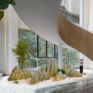 传统中式家居玄关 传统中式棕色旋转楼梯 假山山水3d模型