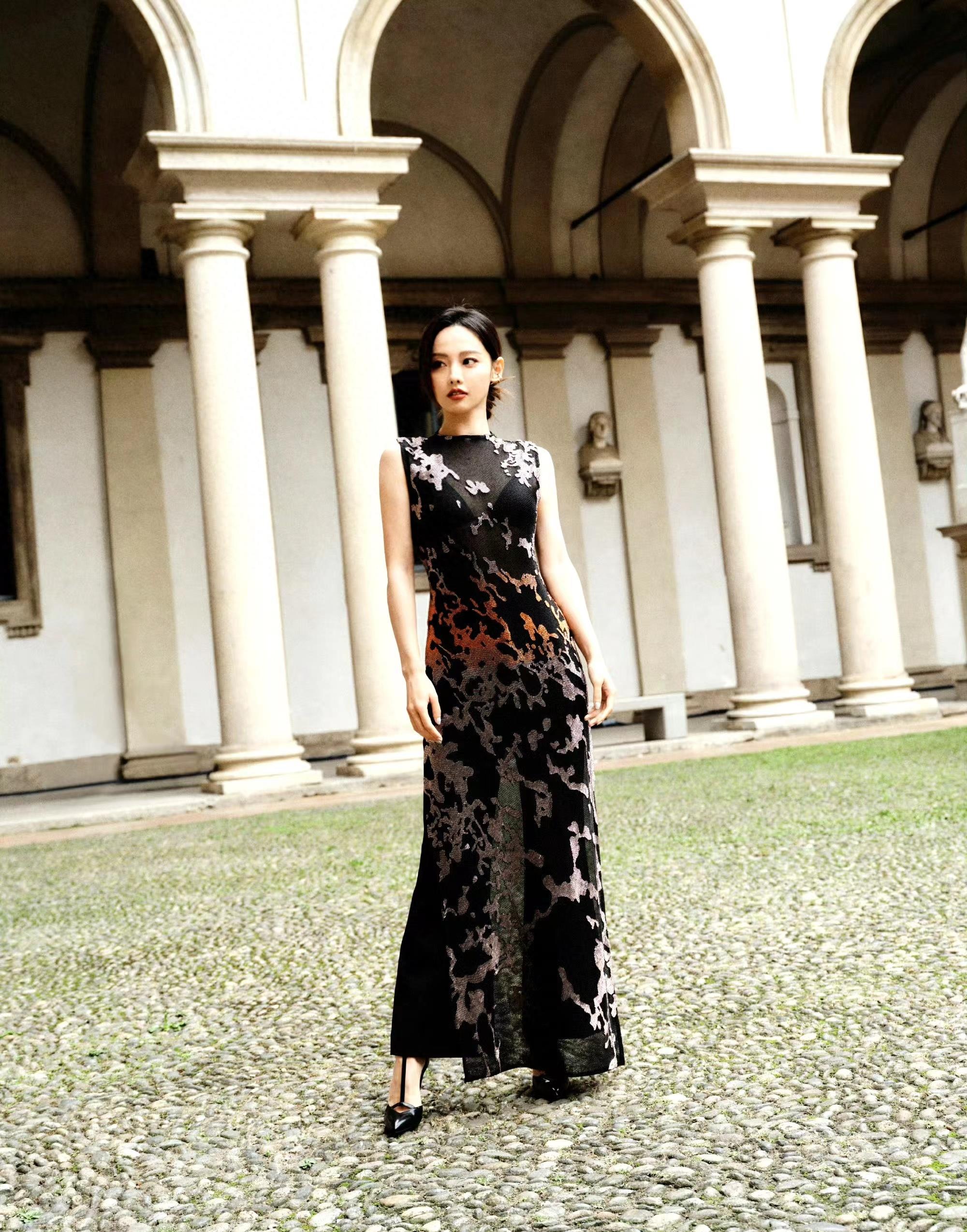 张嘉倪在米兰时装周街拍,身穿黑色刺绣长裙,显得自信大方!