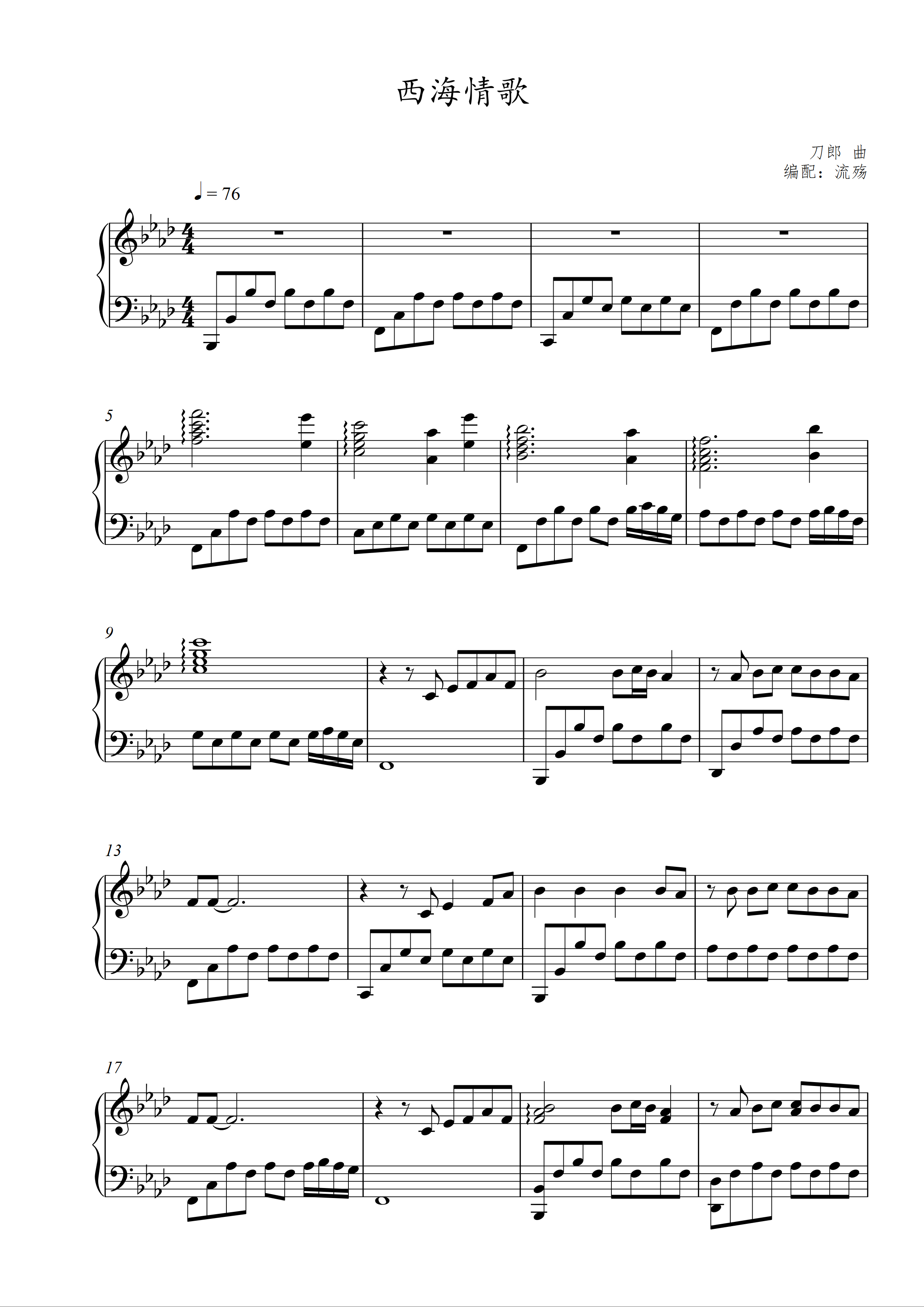 西海情歌钢琴谱_降央卓玛 刀郎_降a调 _流行钢琴谱五线谱独奏谱_钢琴